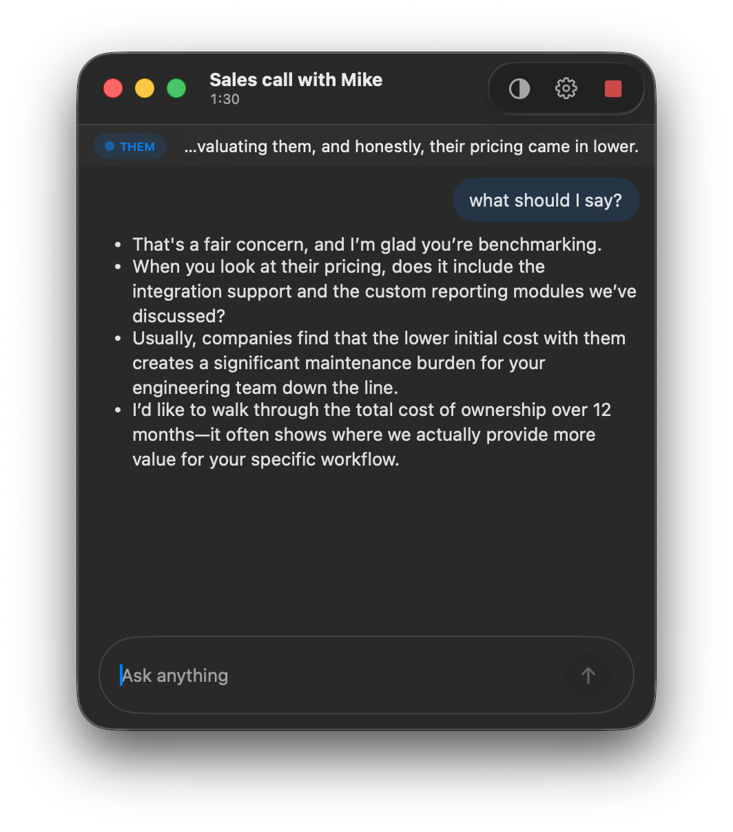 A private, on-device assistant for the meetings you'd rather not improvise. Built for macOS.